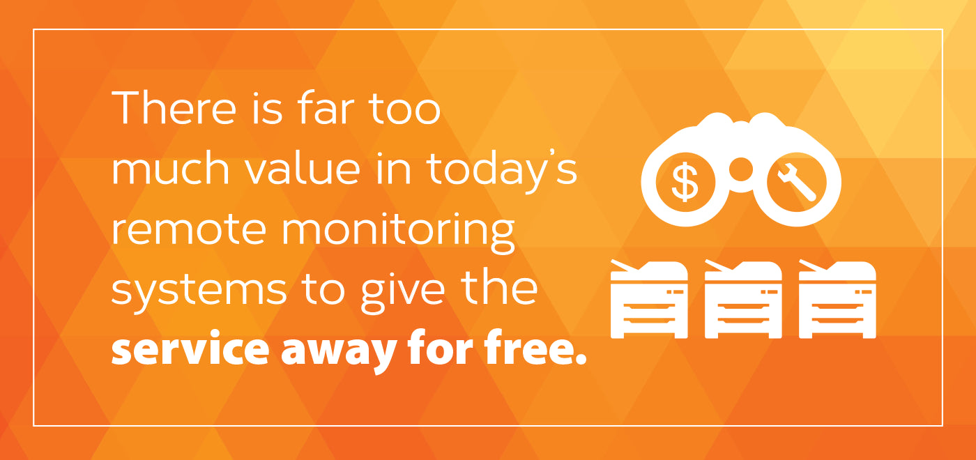 Customers should pay for the service of monitoring and managing any print device on their network. Keep in mind that it’s not just the software cost you are giving away, it’s the value that your company adds to it with product knowledge and industry experience. You are saving customers’ time and money. You are helping them make better asset purchasing decisions. You are saving them hours of manual labor, and you are protecting their IT network by removing potential vulnerabilities. Customers should pay for these services, either directly or indirectly, via commitments to buy supplies, service, or hardware.