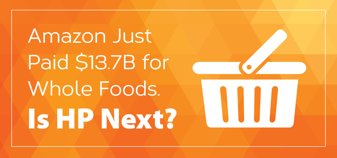Last Friday Amazon acquired high-end grocery retailer Whole Foods. This move was so over the top brilliant, that it immediately drove down the stock of Walmart and other food retailers by as much as 10%. Apart from the potential affect of how this might change where you buy groceries, I immediately thought that if Amazon can make that kind of purchase, could and should they do the same in our industry by purchasing a product company like HP?